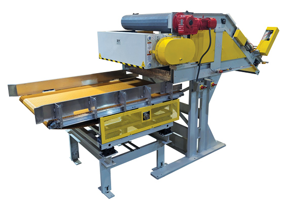 The cut pieces are dropped onto a weigh conveyor for precise measurement. As the cut pieces reach the targeted weight, the conveyor slows down, allowing the pieces to get smaller until the targeted weight is reached. This reduces labor costs and provides for more accurate weighing.